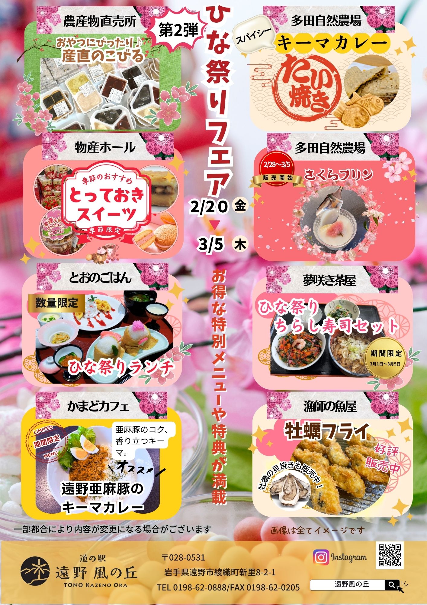 多田自然農場の≪さくらプリン≫、夢咲き茶屋の≪ひな祭りちらし寿司セット≫、 かまどカフェの≪亜麻豚キーマカレー≫など、この期間だけの限定メニューが登場しています。 とおのごはんの《ひなまつりランチ》も引き続き好評提供中です。 いずれも数量限定のため、ぜひお早めにお楽しみください。 🌸🎎🌸🎎🌸🎎🌸🎎🌸🎎🌸🎎![]()
