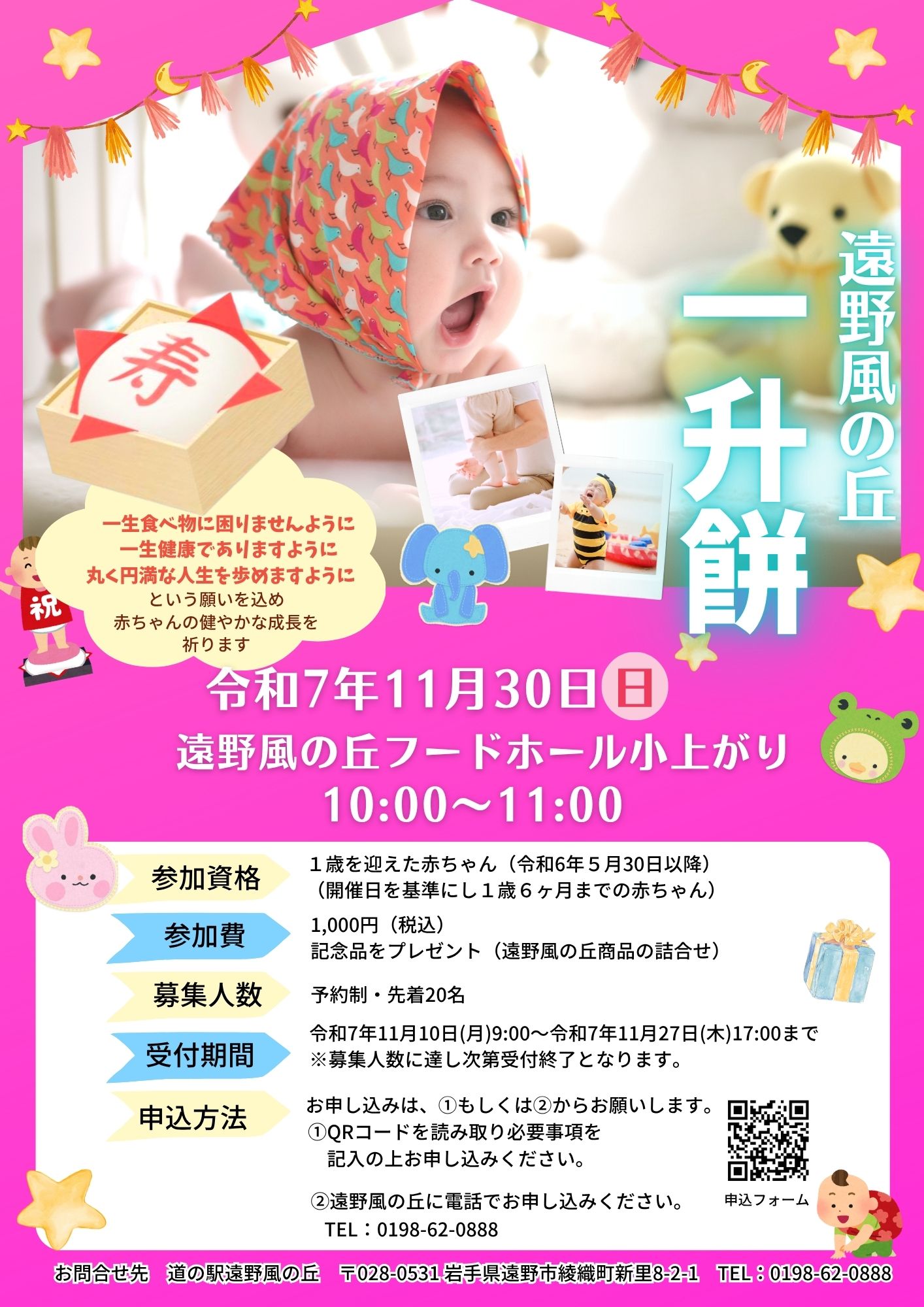 一升餅行事を行います。【11月30日(日)・予約制】 2025.10.18 2025遠野風の丘「一升餅」行事を開催します。 参加する場合は事前にご予約が必要となります。 お申し込みは、webもしくは遠野風の丘までご連絡ください。 皆さまの参加をお待ちしております。 前のページに戻る