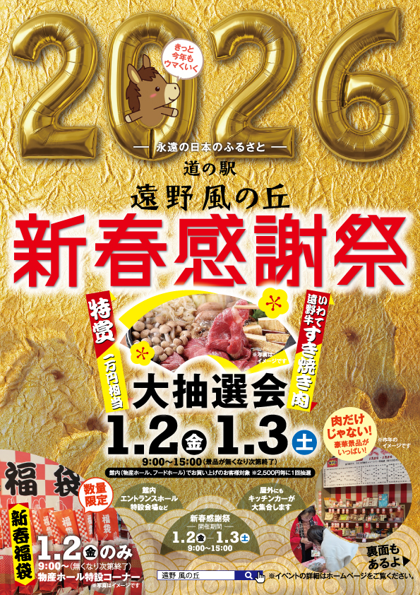 会場では、特賞「遠野牛すき焼き肉」1万円相当が当たる新春大抽選会をはじめ、豪華景品をご用意しております。